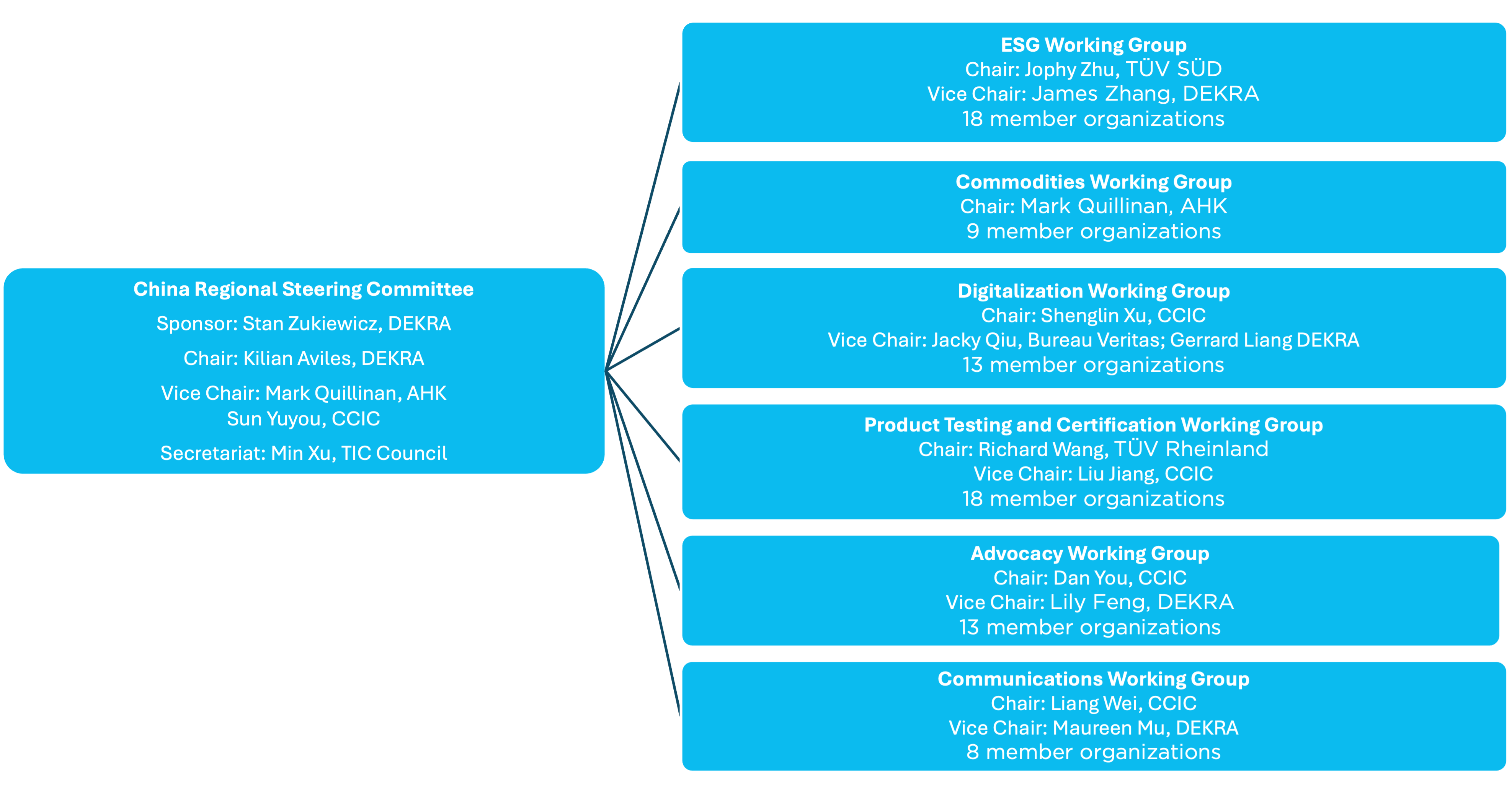 The management teams of TIC Council member organizations collectively form the China Regional Steering Committee (RSC) and currently oversees six specialized working groups: Commodities; Product Testing and Certification; Digitalization; ESG; Advocacy; Communications.